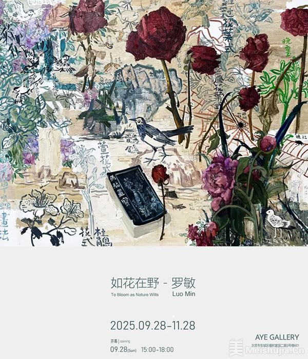 AYE 画廊将于9月28日至11月28日举办艺术家罗敏的个展“如花在野”。罗敏以表现主义的绘画手法重新演绎花鸟主题,既吸收了传统绘画中关于花卉与禽鸟的线条感、留白与诗性意境,又借鉴了西方绘画的厚涂肌理、色彩冲击与结构性光感。画面中既有悬浮的离丛玫瑰,花枝底部斜切,似静物被释归自然;也有中国线描花卉、鸟雀与蛛网的细腻描绘,打破透视秩序。《如花在野》不仅是一次跨文化的图像实验,也是对“图像何以为生”的再追问。在自然与观念、传统与当代之间,罗敏让花鸟成为文化互文的符号,同时也是观看方式变革的见证者。