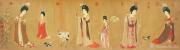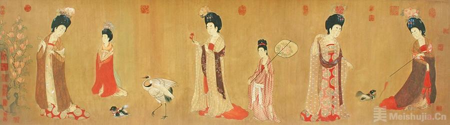 唐代的服章之盛在周昉的《簪花仕女图》中绽放极致:斜领大袖纱衫如蝉翼覆体,透映出丰腴体态的柔美曲线;高髻簪花、蛾眉朱唇的妆饰与宽博飘逸的衣袂,构建起唐代贵胄女子“绮罗纤缕见肌肤”的审美范式。