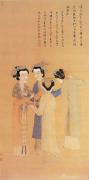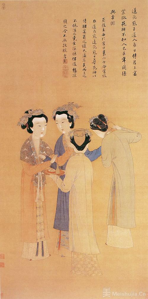 北宋和南宋时期仕女图的服章书写,随题材转向市井而呈现实用化转向:牟益的《捣衣图》中妇女的窄袖襦裙、梁楷的《亲蚕图》里织女的素色布衫,取代了唐代的纱罗大袖,衣长缩短至膝踝,袖型收窄便于劳作,裙裾去除繁复纹饰,仅以素色或简淡折枝纹点缀。即便描绘富家女子,亦多着交领对襟褙子,衣身窄小贴合身形,腰间系带强调曲线,一改唐服的张扬外放,形成“窄袖瘦身、轻裾便捷”的新范式——这种服章变革,既是宋代市井生活对服饰功能性的需求,更暗合程朱理学影响下“敛身守礼”的审美转向,使服饰从贵族的身体装饰,变为民间伦理的物质载体。