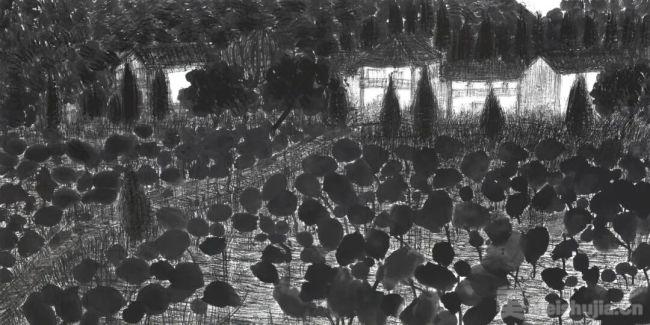 我在表现荷塘时,不拘泥于对荷叶的细致描绘,而是尝试用意向手法来表达我对荷塘的感受。我在作品中既注自然⻛光的生态描绘,又注重乡村⺠居美景与时代审美的融合,点线面在荷塘中疏密有致,小径蜿蜒于荷塘深处,漫卷的荷塘与静穆的⺠居、⻘峦动静相宜。我试图通过朴素而又节奏清晰的画面,营造出人行天地间的空阔与超然意境,并在空间处理、构图方式、视觉呈现方面试图突破传统山水画。