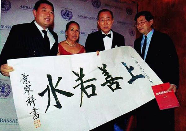 2016年12月,联合国秘书长换届时。五个大国分别送一份国礼给潘基文。中国由联合国华人友好协会选用本人墨宝(上善若水)作为最大国礼。