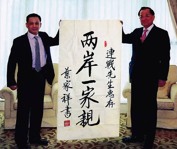 2016年9月大陆高级参访团拜会马英九,连战时,选用本人墨宝《两岸一家亲》传递两岸深情。