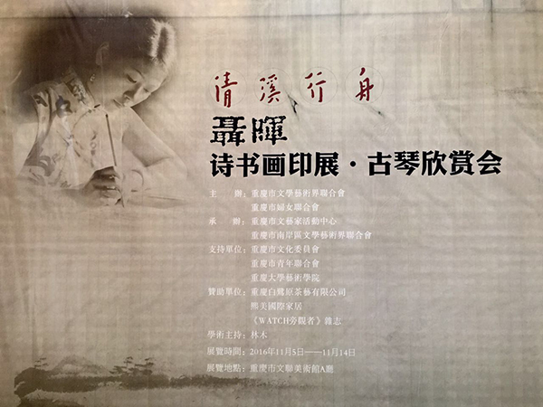 由重庆市文联、重庆市妇联主办,重庆市文艺家活动中心、南岸区文联承办,重庆市文化委、重庆市青联、重庆大学艺术学院等单位支持的“清溪行舟”聂晖诗书画印展于2016年11月5日下午15时在重庆市文联美术馆开幕。