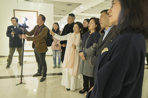 开幕式后,聂晖带领来宾共同欣赏作品,讲解创作思路和感受,作品蕴含的历史文化和背后的故事,展厅的布置设计,让来宾耳目一新。