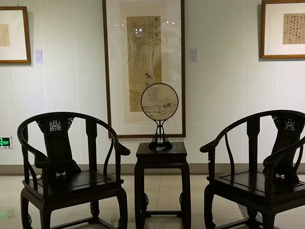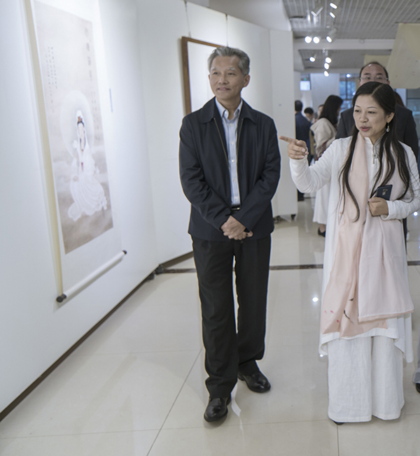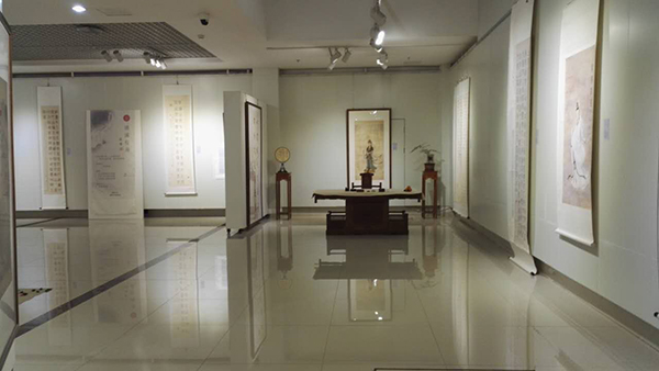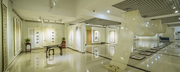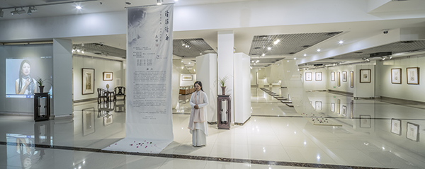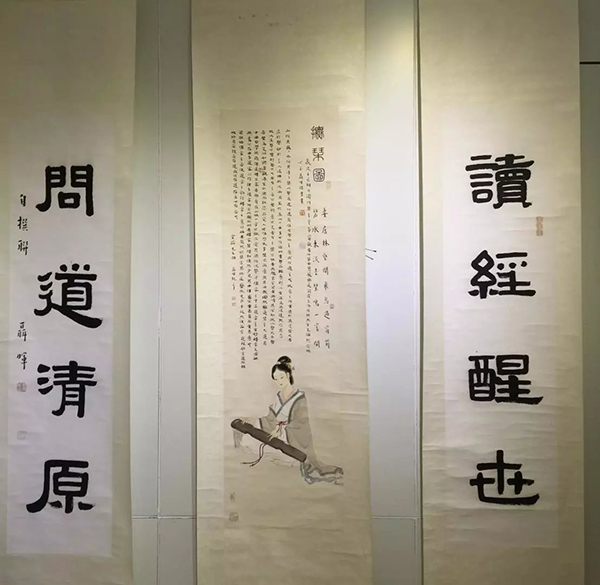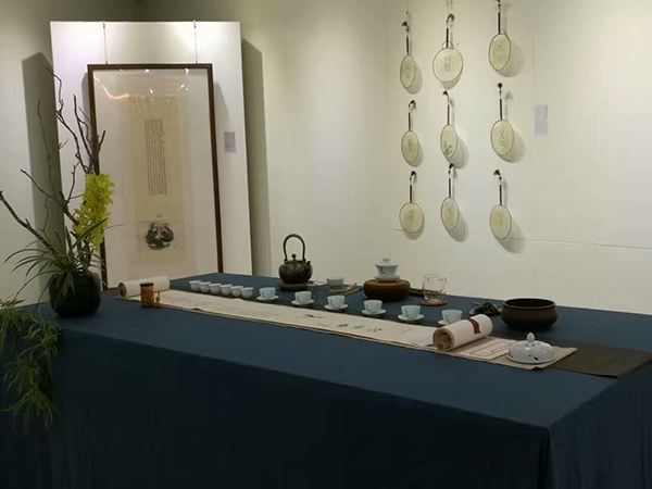 展厅布置新颖别致。一条宽88厘米,长64米的白绢从“天”而降,曲折蜿蜒,环绕在展厅中央。这既象征中华民族母亲河、自然界神奇瑰丽的长江黄河,也诠释了文化是条河流,历史、艺术也是河流;白绢上面飘着花瓣,充盈着“时有飞花至,远随流水香”的诗意。“行舟”是求学,也是修心,还是问道。茶室、琴房、画室、书房将展厅分为起承转合四个篇章。从“结绳记事”的绳结中走进茶室,有《伏羲女娲手持规矩图题跋》、有《八卦》组作、《涂朱祭祀牛骨题跋》、《三才》、《四灵》、《五行》、《十二地支》等作品,更有篆刻作品等等,展示着中华文化艺术“源远流长”。第二篇“高山流水”,既有抚琴图、抚琴诗、《山水清音》画,还有卷头几上的古琴、香炉,显示着文人雅士“左琴右书”的典雅生活趣味。第三篇“曲径通幽”,工笔观音、深远山水,展示着求学问道的坚定执着、峰回路转柳暗花明。第四篇“清溪行舟”则以文人山水画为主,充满道家的“逍遥无为”。
