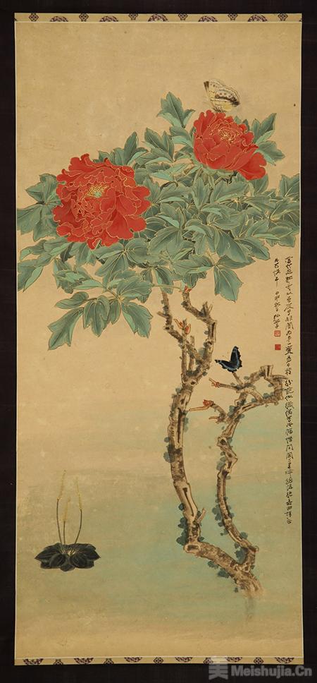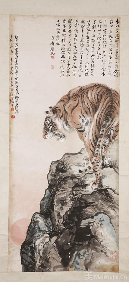 如展出的一幅由张大千与其二哥张善孖合作的《猛虎贯日图》,就非常引人瞩目。众所周知,张善孖对大千艺术道路的影响至关重要,早年二人共赴日本学习印染,创办大风堂,鉴藏古书画,切磋画技,以“双髯”并称。张善孖还引荐大千结识了众多各界名流、艺术前辈。1931年发生的“九一八事变”是日本侵华战争的开端,这年冬张善孖绘《猛虎贯日图》激励抗战士气,张大千亦题字其上,言辞决绝果敢,慷慨激愤,既是张氏昆仲情深的表达,合作的见证,更是他们兄弟二人坚贞爱国的体现。