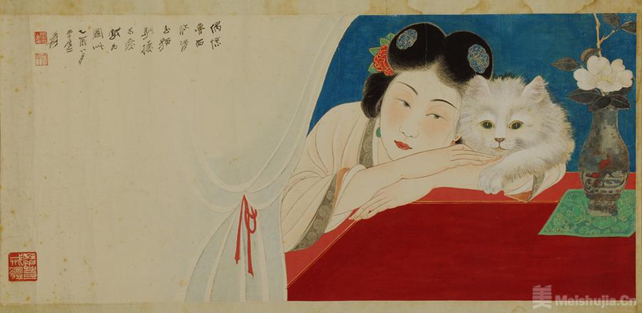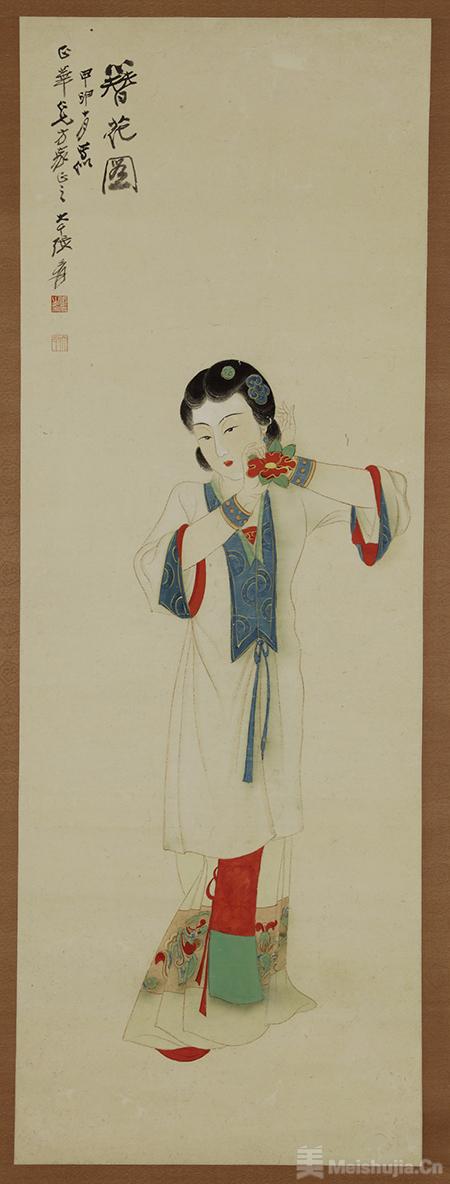 求艺敦煌的经历是张大千抗战时期绘画中无法抹去的一页,也是奠定他绘画大师根基的一页。在两年七个月的时间里,张大千朝夕与中古艺术对话,逐渐清醒地认识到绘事本应恢宏壮阔,眼界决定心胸,这为他日后画面中呈现的壮阔气度和震撼人心的力量埋下伏笔。他也更加重视线条和勾染的力度,开始广泛地使用复笔重彩技法,使得画面更加瑰丽,气韵更加浑厚。1944年5月,“张大千临摹敦煌壁画展览”在重庆两路口中央图书馆举行,他在敦煌所有的努力汇聚成的优秀作品被展示在世人眼前,不仅鞭策了有志之士投身于对敦煌文物的保护之中,也打破了抗战的沉闷之气,让国人正视我们自己博大精深的传统文化,从而树立民族自尊心和自信心,增强凝聚力和抗战必胜的信念。《临西魏夜叉图》轴就曾出现在这次展览中,75年后又重回故地向世人讲述那段历史,别具意义。《簪花图》《红妆驯猫图》的人物有着丰润健康的体型和清新的时代感,衣纹、发式、装饰灯也大量借鉴了敦煌壁画的图案,体现了张大千敦煌归来之后画风的变化。
