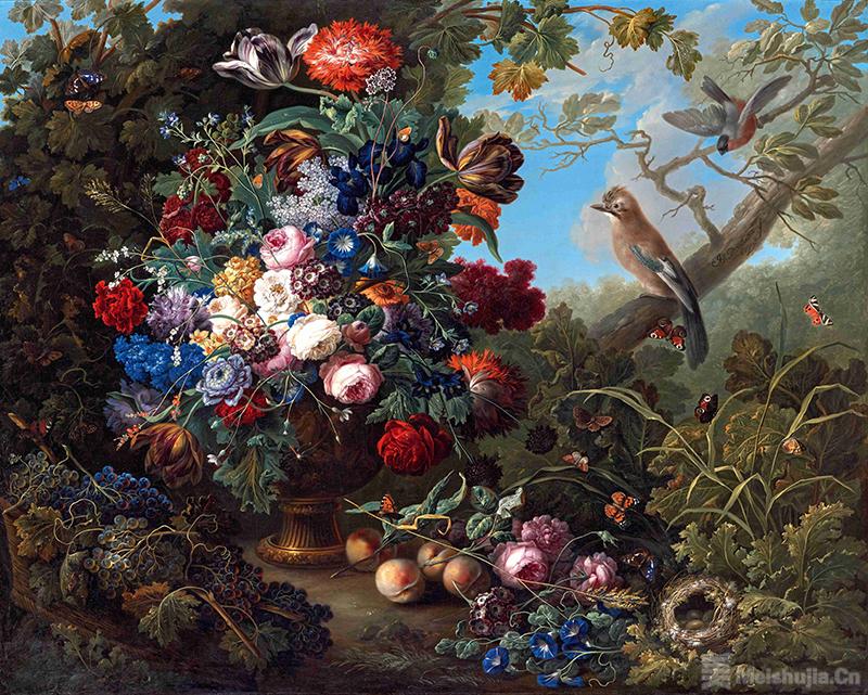 (1/3)《大型花卉静物与鸟》,Johann Baptist Drechsler,1799年,布面油画