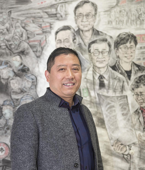 如果说这些乡土气息浓郁的作品是尹育虎长期熟悉的题材与关注点,那么另一拨以抗击新冠疫情为主题的作品,则直接体现了他对当下生活的切入。《待发》《最美逆行者》描绘的是正在奔赴医疗前线的医护人员、《鏖战火神山》描绘的是应急医院的建设者、《守望春天》描绘的是在每个岗位上默默付出的工作者、《守望》里的老人和孩子是这个春天最为温馨的画面。虽然这些作品在构思和表现还有些仓促和直白,但也更直接地表现了画家的责任与担当,表现的不仅是人与人之间相互依存、对抗、合作、奉献的关系,更是中华民族在这危急时刻表现出来的勇敢、奉献、昂扬的精神状态。