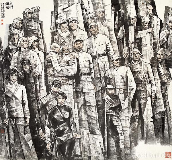 两位画家还大胆吸收西方立体主义的理念,将人物组合与岩石结构进行几何化的分割与重组。在画面中,英雄群像与太行山势并非简单的“人在山中”,而是通过块面的穿插、空间的压缩,形成一种群雕式的象征性构图。人物不再是孤立的个体,而是如同山体岩层般紧密联结,既突出了个体的坚毅,又强化了集体的力量感。这种融合,消解了传统与现代的边界:立体主义的形式感让画面更具视觉冲击力,契合了现代观众的审美习惯,而传统笔墨的精神内核,又让这种现代形式始终扎根于民族文化的土壤。