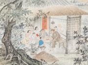 1956年,唐云在收藏家钱境塘家中偶遇任伯年的金笺通景十二条屏《群仙祝寿图》,这件工笔重彩杰作通过五大组块布局,人物疏密错落,辅以祥云、海浪、楼阁、花木,形成宏大连贯的叙事空间。12条金笺屏,以泥金为底,采用石青、石绿、朱砂、铅粉等矿物颜料绘制,金碧辉煌,成本极高。在唐云的力荐下,最终促成上海美协以1200元购藏此巨制,避免国宝外流。展览序厅“丹青筑梦写春秋”板块便展现了此作的木刻水印版。