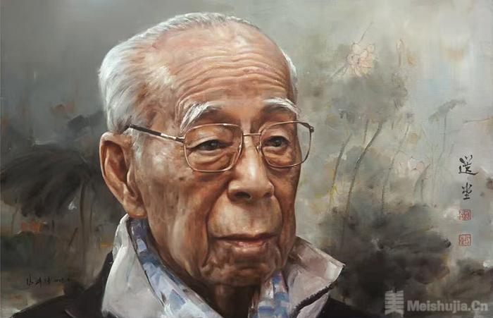 画面背景以略带暖意的浅灰色调为主,并以隐约朦胧的淡墨色荷花造型衬托,在题材构思上呼应饶公高洁的人文品格。画面右下方附有“选堂”题字及其两枚印章,进一步强化了主体人物的名号身份和中国传统文化的符号语境。在表现手法上,前景人物头像充分具体写实,背景则注入东方写意精神,大笔触、大面积铺色渲染,虚化处理,形成主次对比,虚实相生,和谐统一。整幅作品兼具油画的真实细腻质感、立体块面体量感,以及水墨的平面抒写渲染、流畅韵致,意境格调脱俗高远,清新儒雅,厚重空灵,生动形象再现了国学泰斗饶宗颐先生的晚年风采,一位文化学者特有的睿智与从容。