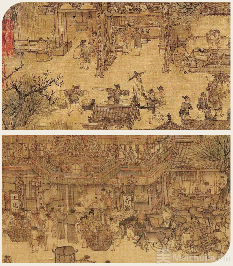 从《清明上河图》上可以清晰地看到,商人比比皆是,商品琳琅满目。汴河两岸店铺林立,街道上游人如织。穿过城门进入内城,更是一派热闹繁华光景。