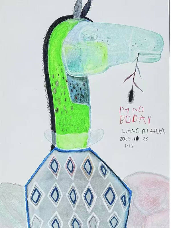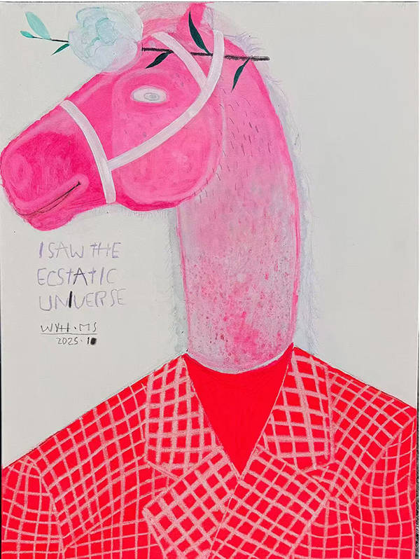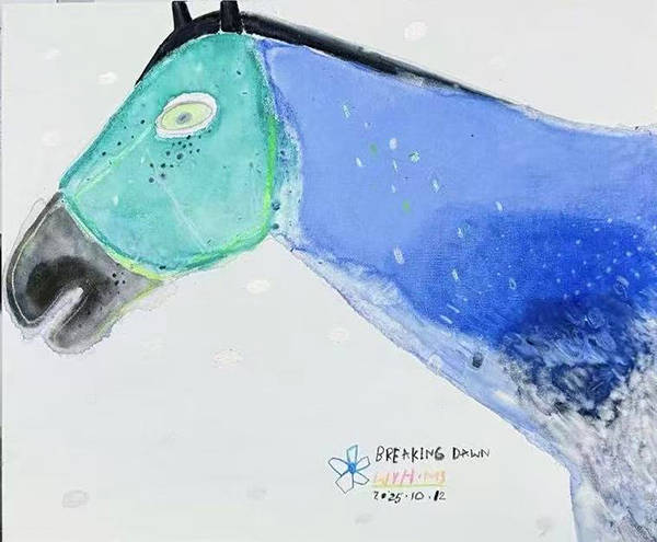 站在王玉华营构的艺术作品前,画面充满了气息的流动、时间的延宕与生命气息的回响。马匹的动势在将发未发之间,轻声唤起我们对自身生命状态的“觉知”,从碎片化、喧嚣的信息洪流中抽离,感受到她源于中国传统文化中“道”的哲学底蕴——摒弃浮华,直指本心。画面在物质材料的不同层次中,反而生发出一种精神性的“单纯”。在王玉华看来,绘画从不是单向的,需要画家与观众的互动与交流,审美于此演变为一种应对当下的“精神工具”,使这些异质材料在碰撞中达成和谐,进行本质的当代转化,诠释着“与万物和谐共存”的东方智慧,完成一次从艺术到日常的“量子纠缠”,成为她所倡导的“不是教你看懂艺术’,而是教你‘通过艺术看懂自己’”的实践路径。