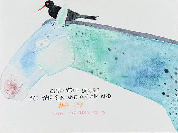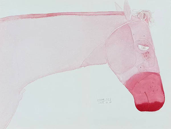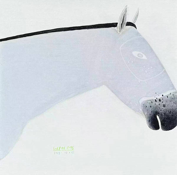 《马语轻喃》系列作品最动人处在于其“不着力”的淡然。这种“淡”是艺术家历经提炼后的澄明,王玉华笔下马的形态以简练而富有“有意味形式”的线条,辅以矿物颜料的自然晕染,与墨色的微妙渗透,形成如拂晓空旷时空的视觉质感——清冷未褪,暖光初临,色彩与线条的共振并非刻意追求形式创新,而是艺术家内心“觉知力”的自然外化,宛若在破晓时那种超自然的状态中,赋予马儿超然的宁静,在无声地言说一种朴素的温情,展现“内在开花”的生命状态。观者与之相遇,被引入一个可以将“清空目光”暂存的凝思空间,借助这种新的“凝视逻辑”,以一种“站在无形看有形”的视角,让观者很容易对“精神留白”的追索。
