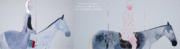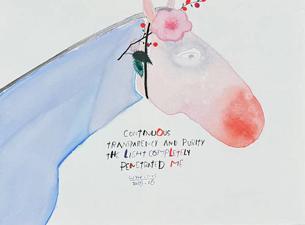 王玉华的《马语轻喃》系列作品以马为媒介,她以其极简的造型、纯净的色彩,在画布上以墨、矿物颜色、水的的交错叠印,形成一种近乎禅意的“空谷回声”,清新而轻松,完成对东方美学本质的当代叩访,呈现出回归生命本源的“觉知之象”,在喧嚣,以及对未来不可知的迷茫数字时代背景下,汇成一种超越时空的视觉体验,缓缓渗入人的情思,抚慰人的心灵。